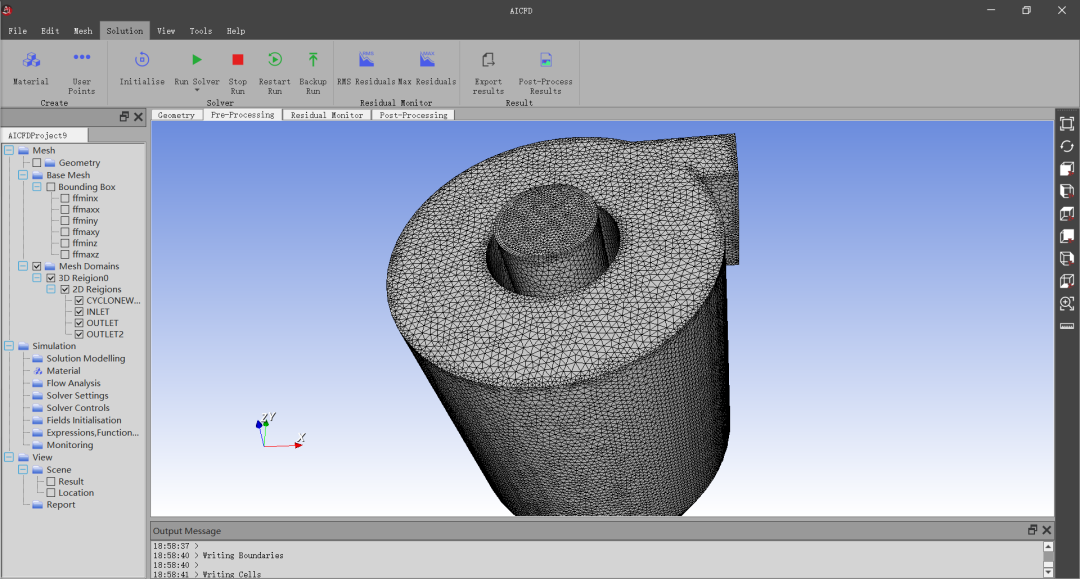 本案例为旋流分离器,它是一种常见的分离分级设备,采用离心沉降原理去除掉流体中的物质颗粒。该案例涉及的流动为不可压流动,流体从进口进入旋流分离器向下回旋至底部,然后向上回旋从出口排出。